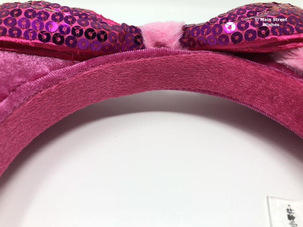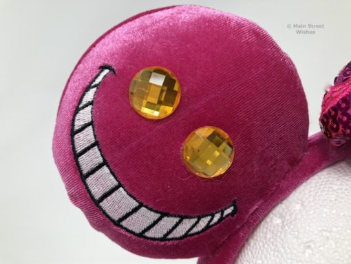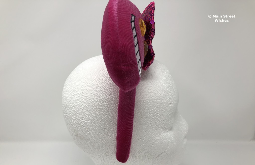 The ears are covered in a velvet-like material, making them soft to the touch. The color of the material is the same purple/pink color that the Cheshire Cat is in the movie. On one ear is the cat’s mischievous grin with two yellow gems for the eyes. On the other ear is a swirl of soft, fuzzy, pink material that is swirled around the ear. The swirl reminds me both of the stripes on the Cheshire Cat and the tail. Both ears have a good amount of stuffing in them, so they are thick and very soft.