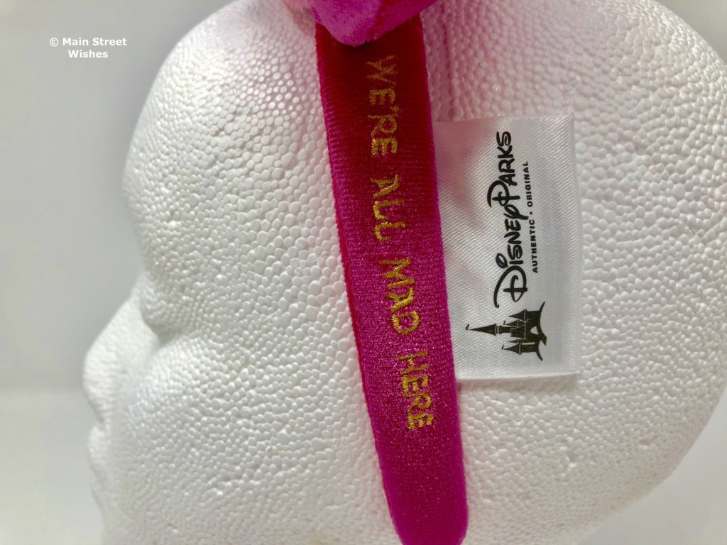 The headband is covered in the same velvet-like material that covers the ears. Both the inside and the outside are covered in this material, so it’s pretty comfortable to wear. This headband doesn’t feel as tight as some other ones, so I was able to wear it a little longer than other headbands. A fun part about the headband is that on one side it says “We’re all mad here” from Alice in Wonderland.