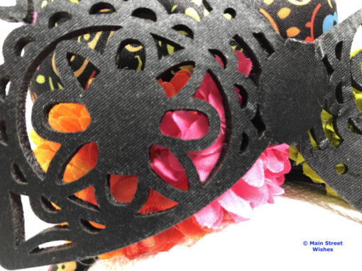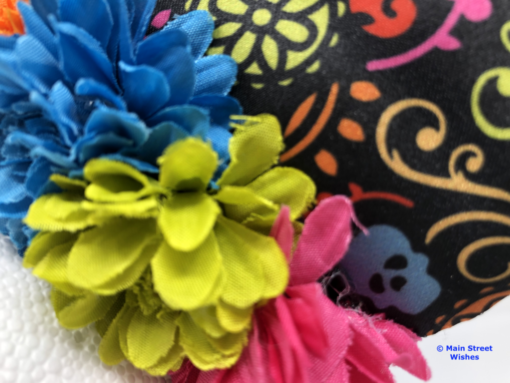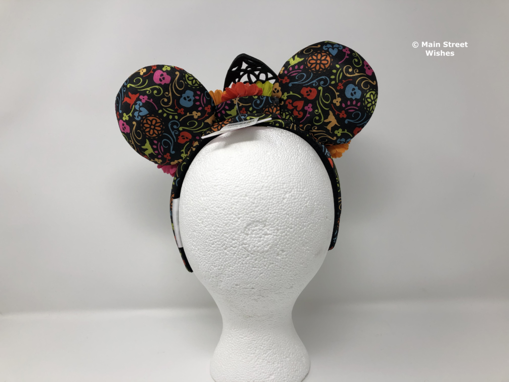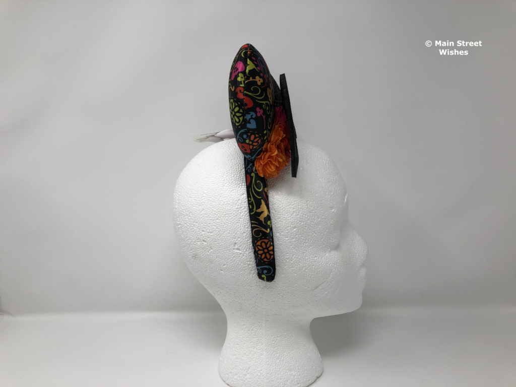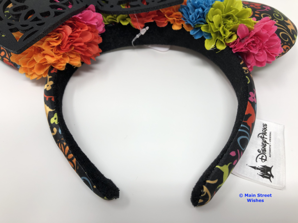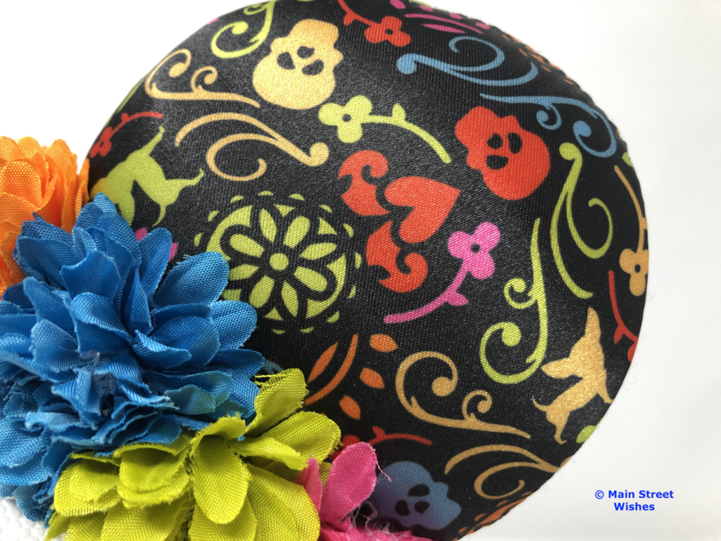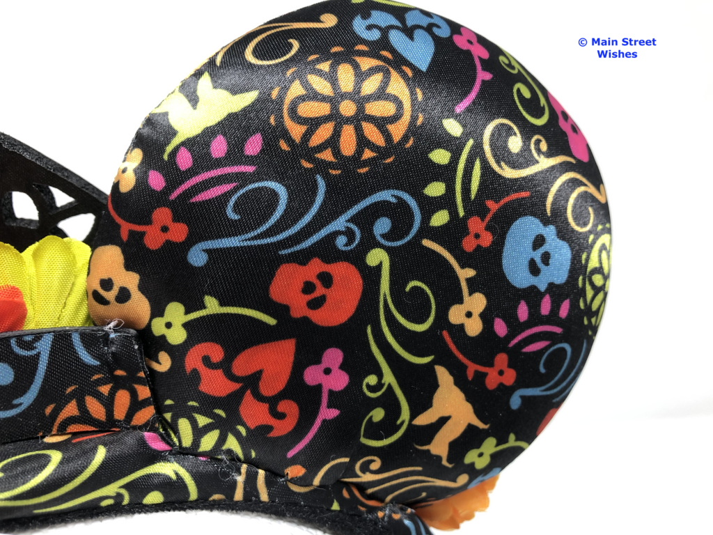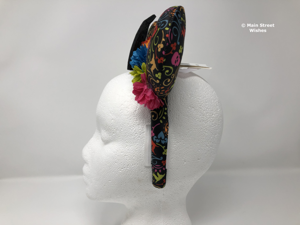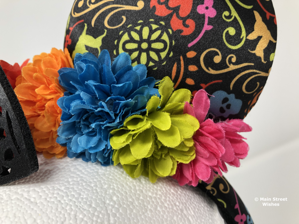 Also on top of headband are flowers that arch with the headband. The flowers are the same colors as the colors in the design on the ears. There are blue, pink, green, and orange flowers and just like the design on the ears, the colors are bright.
