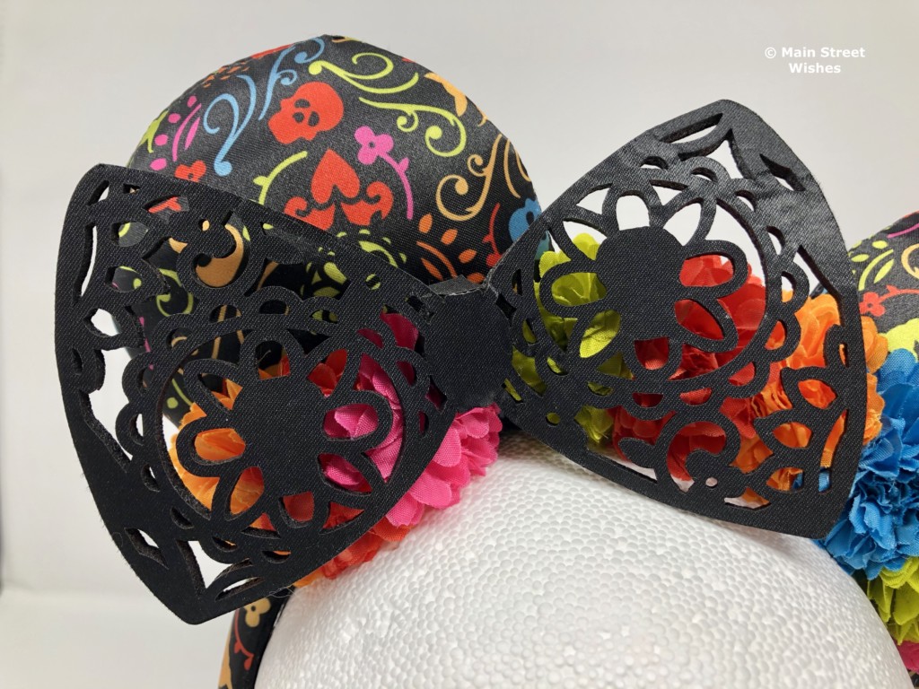 The bow on this headband is made of two pieces of material glued to a soft, flexible foam type of material. There is a design cut into the bow on both sides that matches the design on the ears. The bow is flexible, but if it’s bent too much it does feel like it could break, so keep that in mind.