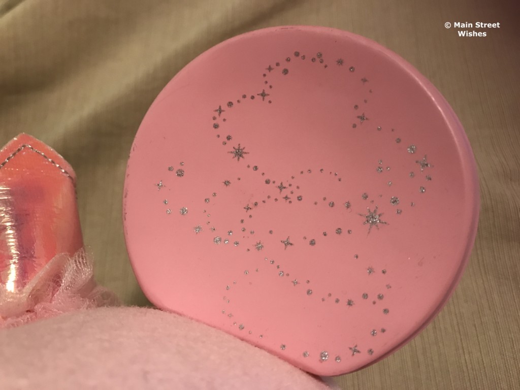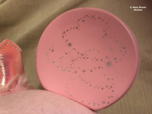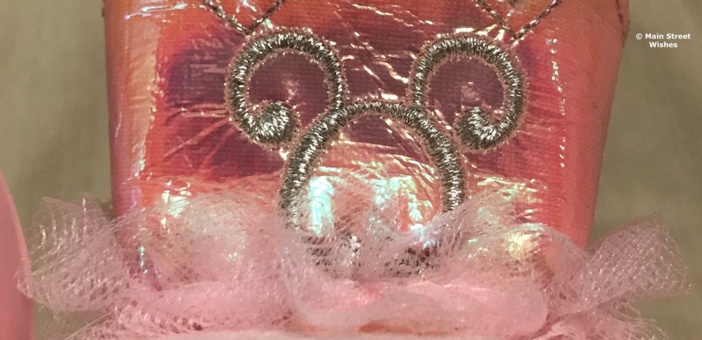 The ears on the hat are pink and each have silver stars, which add some magic to the hat. In between the ears there is a pink crown made of soft material and on the front of the crown is a Mickey outline. Around the bottom of the crown is pink crinoline, giving it a very princess feel.