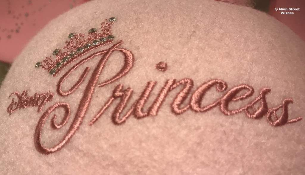 The hat itself is pink and a bit fuzzy. So it’s very soft to the touch, which is nice. Written on the hat is “Disney Princess” with a crown over the ‘P.’ It’s written in big letters, so there is no mistaking that the hat is being worn by a Disney Princess.