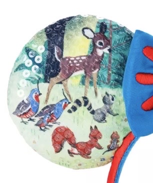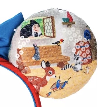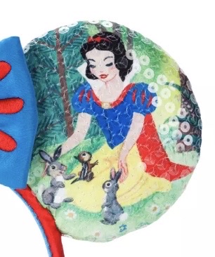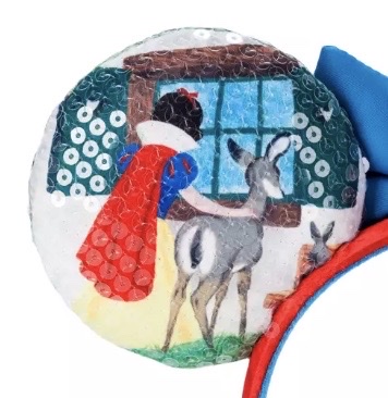When looking at the ears you can see there is a good amount of detail. Each ear has a scene on the front and back, depicting Snow White and her forest friends. On the front of the ears, one has Snow White pictured with a couple of bunnies and a chipmunk in the forest. The other ear shows other animals looking on at Snow White, the bunnies, and the chipmunk. When the ears are turned over there are more scenes on the back. Once scene shows Snow White looking into a window with her hand on a deer and the other ear has the Evil Queen, disguised as the old woman, looking out the window at the animals. Also, the ears are detailed with sequins, so the scenes have a shimmer to them.