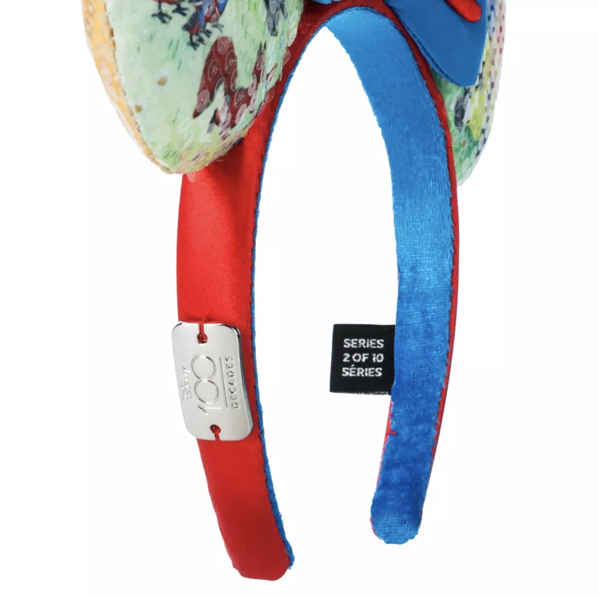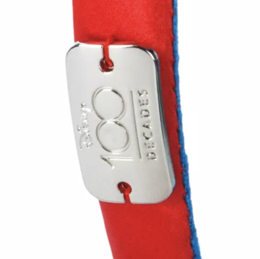 The colors on the headband match back to the bow. There’s a red satin material on the outside and a blue non-slip velour material on the inside. Also on the headband is a “platinum” finish Disney100 Decades logo plate and a label that has the number in the series the headband is.