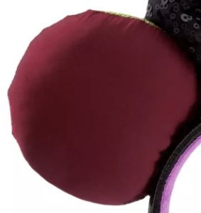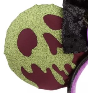 The ears on this headband are probably my favorite part of this pair. The front of the ears have a design of the poison apple. This is the same design that Disney has used for other poison apple products. The design is a glittery green color and is set over a red satin material. That same red satin material covers the back of the ears as well, but there is no poison apple design on the back.