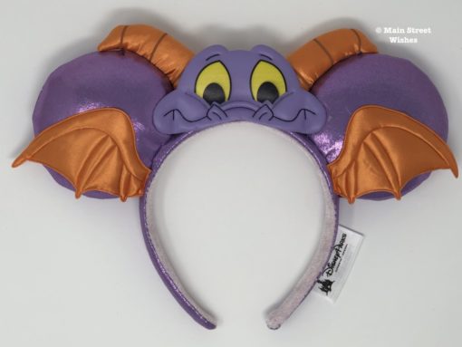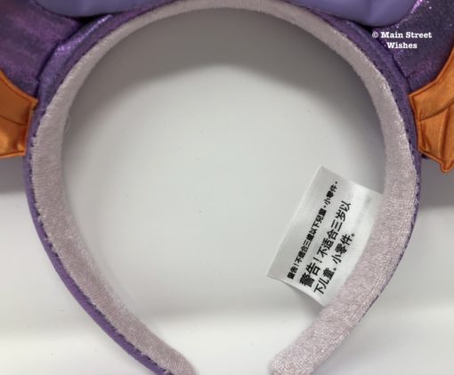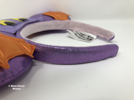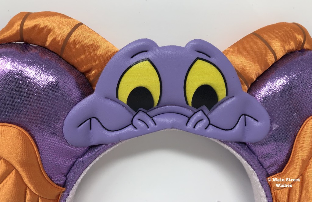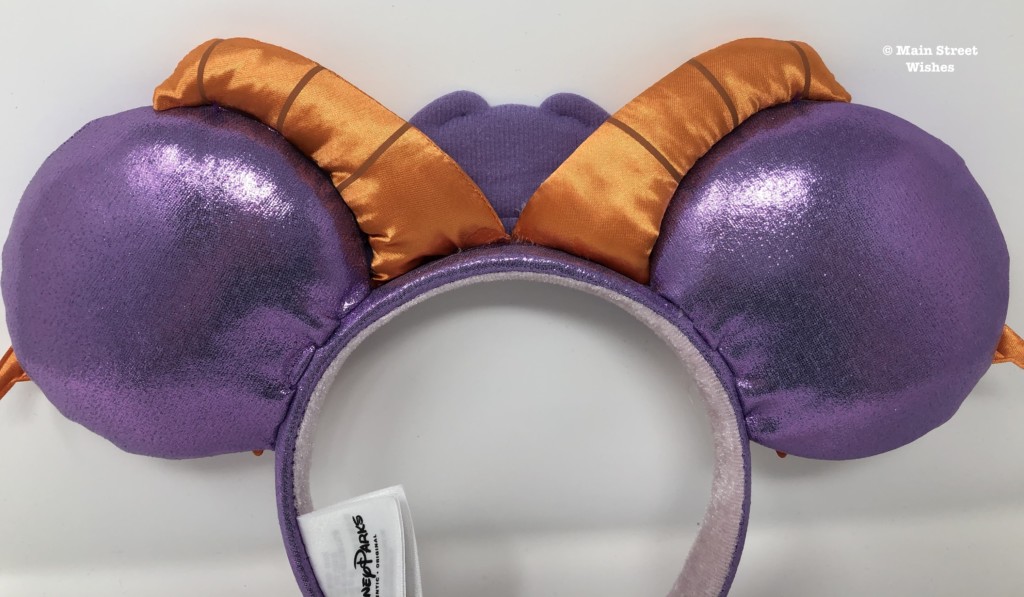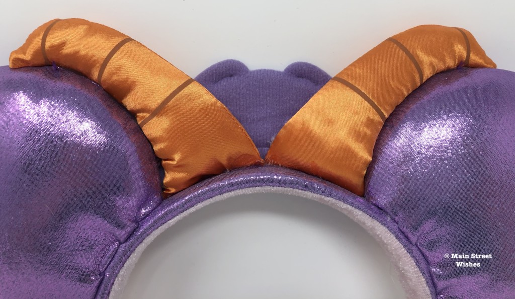 There is no bow on these ears. Instead of a bow, Figment’s face is in between the two ears. The face is made out of a soft vinyl material. The face is purple, his eyes are yellow and black, and purple felt is attached to the back of the face. Figment’s orange horns are placed in back of his face and they are attached to the ears, which makes it look like the horns are coming out of his head.