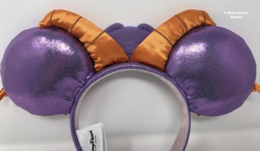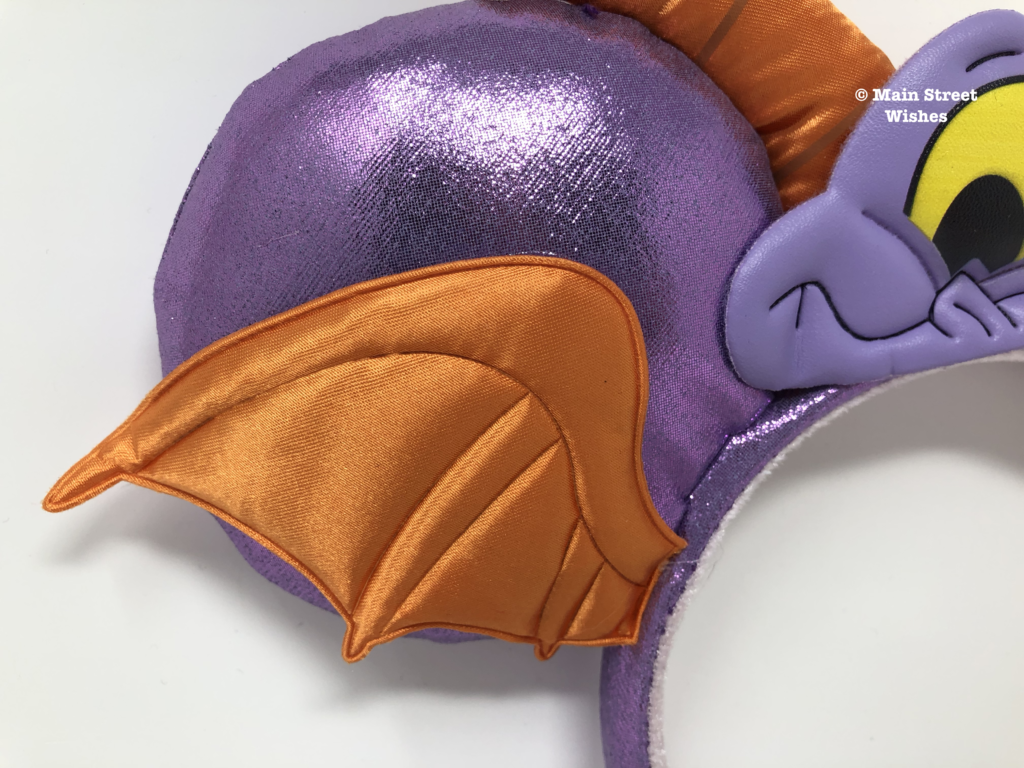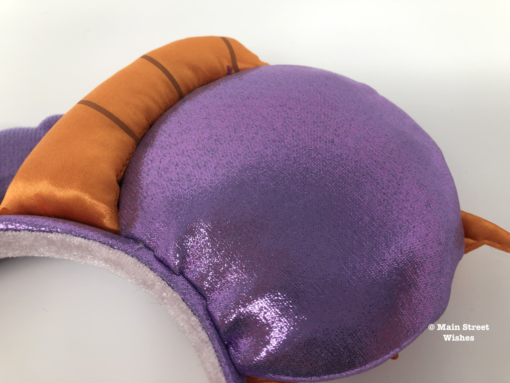 Purple is the main color on these ears, as Figment is purple. However, there are also touches of orange. The ears themselves are covered with a soft, shiny purple fabric. No sequins on these ears! Also on the ears are the orange wings that Figment sports on his back. The back of the ears are just the shiny purple material.