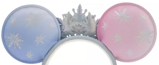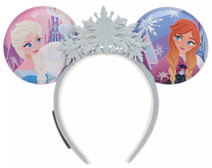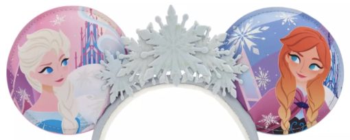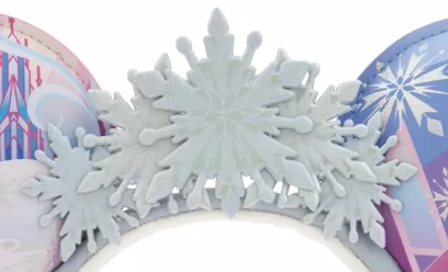 Each of the ears has one of the sisters pictured on it. One ear has Elsa with a pink background and a view of her ice castle. For Anna, there is a periwinkle blue/purple background with some big snowflakes. Each of the ears also has snowflakes on the back with the matching background color that is on the front of the ears.