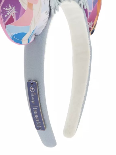 On the headband there is an icy blue fabric on the outside and a non-slip white velour material on the inside. Also, the Disney Loungefly metal plate is on the same side of the headband as the ear with Elsa on it.