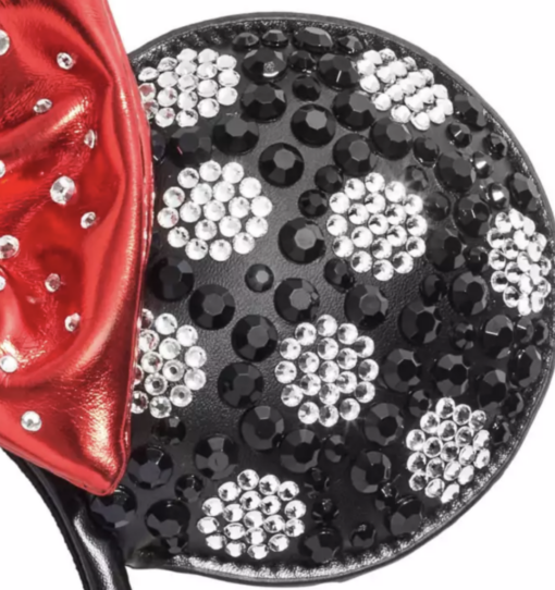 The bow is a classic red color, but it is made of a shiny faux red leather material. Instead of polka dots, the bow has it’s own faceted gems dotting the front.