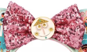 In between the ears is a pink sequin bow and in the middle of the bow is a piece with the same clock face that can be seen on the ride.