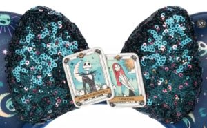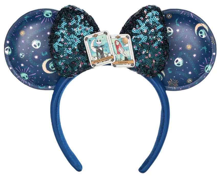 There is a little sparkle to these ears, because the bow is made of a fabric that is covered in sequins. The colors of the sequins match back to the colors in the ears. There is another detail with the bow that is really cute. In the middle of the bow are two tarot cards, one with Jack and one with Sally.