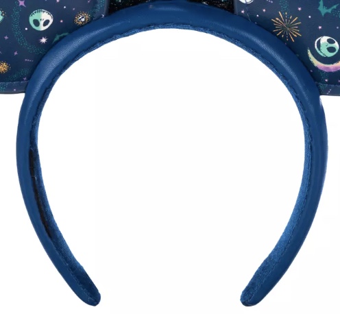 A simulated leather material covers both sides of the ears. On the material is a pattern that includes Jack Skellington’s head, moons, stars, and bats. The same pattern is on both sides of the ears.