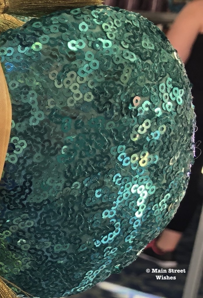 The ears themselves are the same bluish green color as Princess Jasmine’s clothes. It’s a very pretty color and since the ears are covered in sequins of the same color, they sparkle in the sun. Both the front and back are covered with sequins, so there is full coverage on both ears.