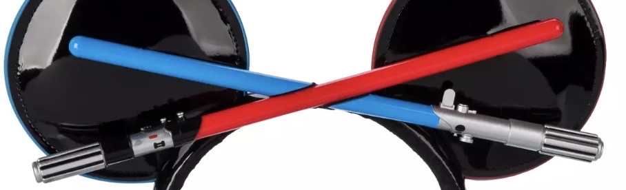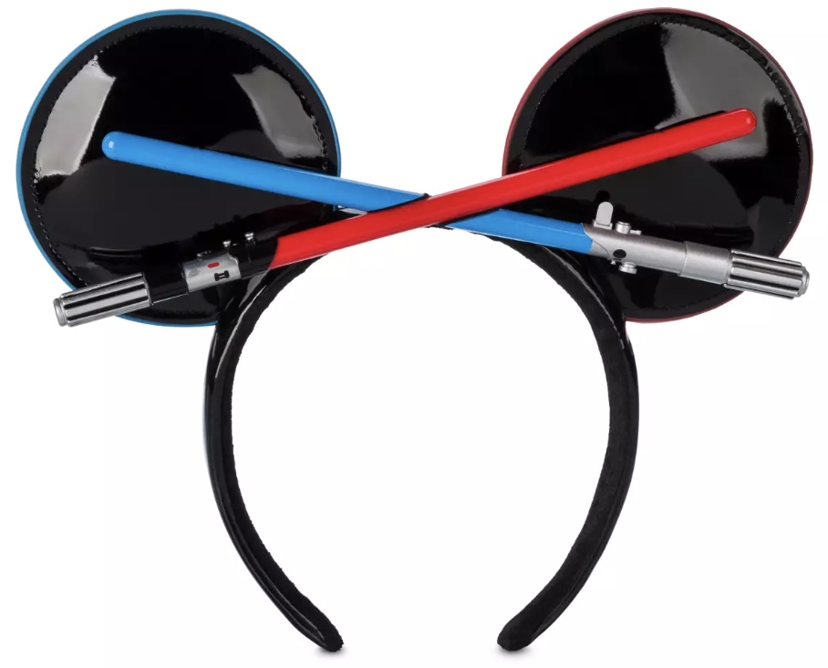 Instead of a bow, this pair has two lightsabers as the center of the headband. There’s a red lightsaber and a blue lightsaber, representing both sides of the force. They cross to make an ‘x,’ as if they are in mid-battle.