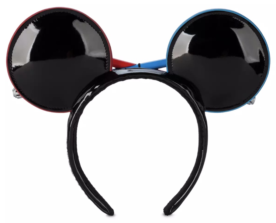 The ears are covered in a shiny black material and each ear has trim around the outer edge. One ear is trimmed with blue and the other ear is trimmed with red.