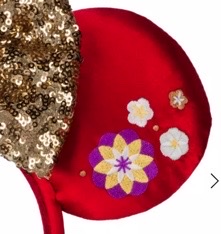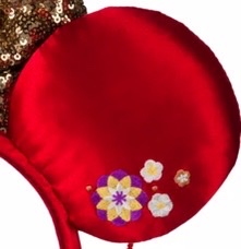 Details are on the ears. There are flower appliqués and pearls decorating each of the ears. One of the ears has a flower appliqué on the back, as well. Another detail that you can’t miss is the tassel that hangs from one of the ears. The fabric that covers the ears is a satiny material and is red in color.