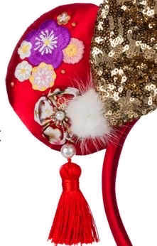 These are a pair of ears with bright colors and a lot of detail on them. They represent the Lunar New Year and seem to be a popular pair, because they already sold out once before.