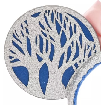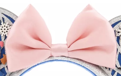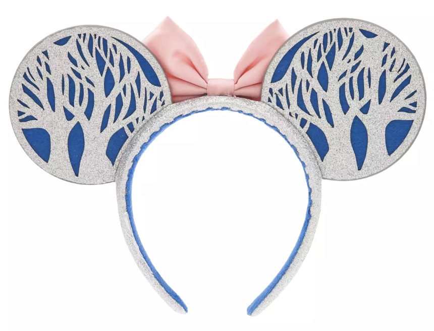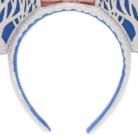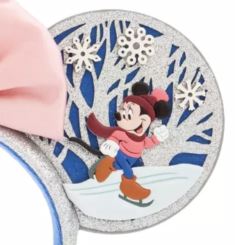 For the ears, Disney designed them to look like a fun winter scene. On the front of one ear is Mickey building a snowman with snowflakes and silver trees in the background. The second ear has the same trees and snowflakes, but instead of Mickey it shows Minnie ice skating. On the back of both ears are the silver trees with a blue background.