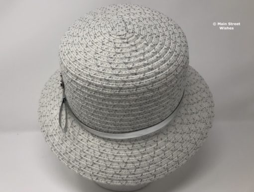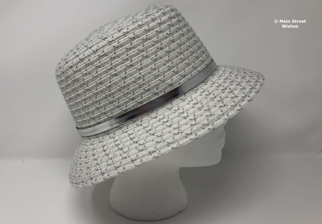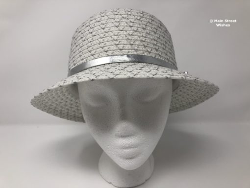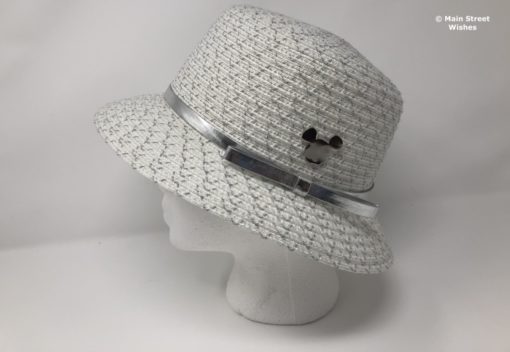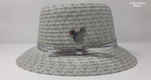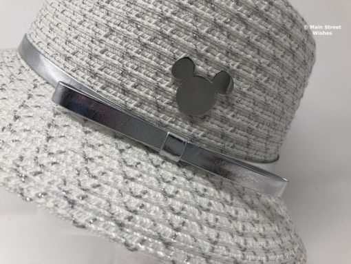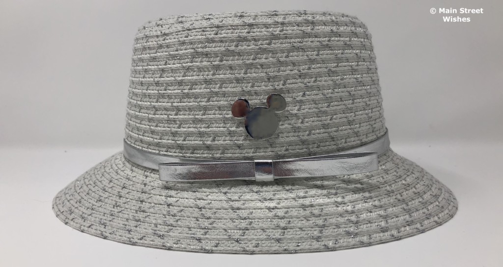 It’s a white straw hat and it has silver, shiny thread woven through the hat. The silver thread gives it that nice extra shine in the sun. Wrapped around the hat is a silver bow. The material used for the bow is thick and it feels pretty durable. Also on the hat is a Mickey icon, located right above the bow.