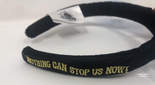The headband has a black, satin-like material on the outside. On each side of the headband there is something embroidered. On the side with Mickey in the ear the headband is embroidered with “Nothing Can Stop Us Now!,” which is the theme song for the cartoon from the ride, “Perfect Picnic.” The other side with Minnie in the ear has train tracks embroidered on it. The inside of the headband is also black, but the material is a velvet-like material.