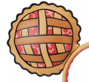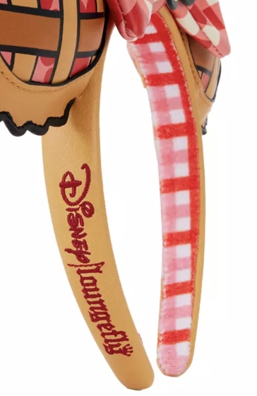 On the headband, the same picnic blanket design on the ears and bow was used for the inside of the headband. The outside of the headband has the same brown color to match the crust on the pie. Also, on one side of the headband Disney/Loungefly is embroidered on it.
