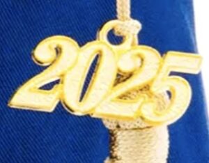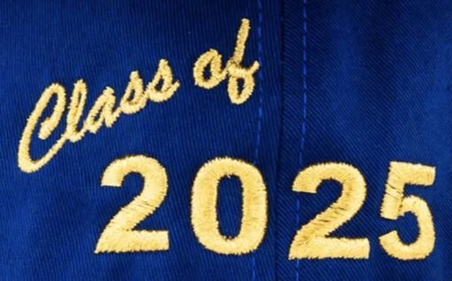 The hat is made from a blue, twill fabric and topped with a mortar board that the ears sit on. “Class of 2025” is embroidered on the front of the hat and the back has an elastic strap. Lastly, the hat has a golden tassel with a “2025” charm on it.