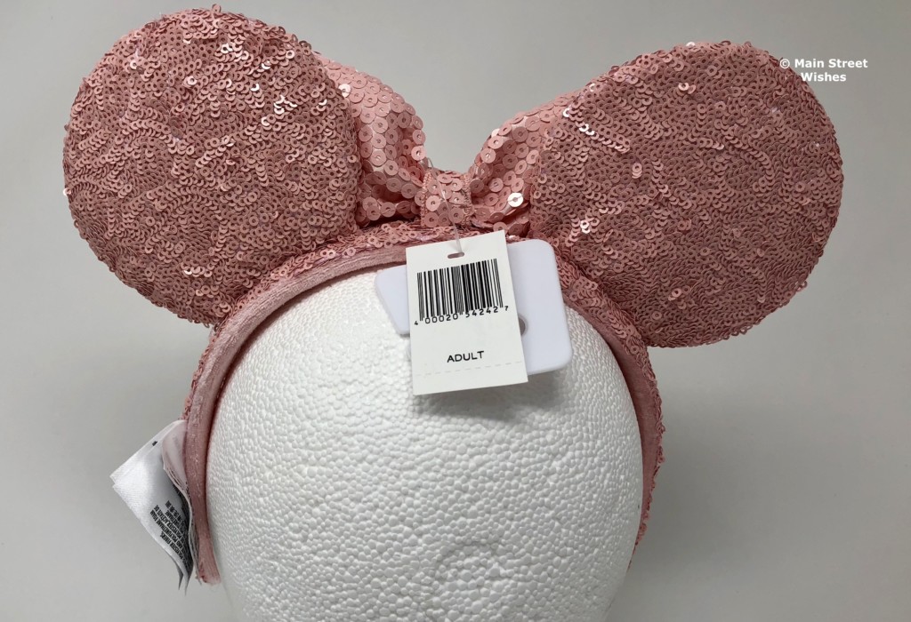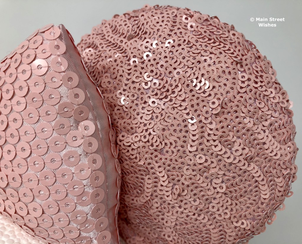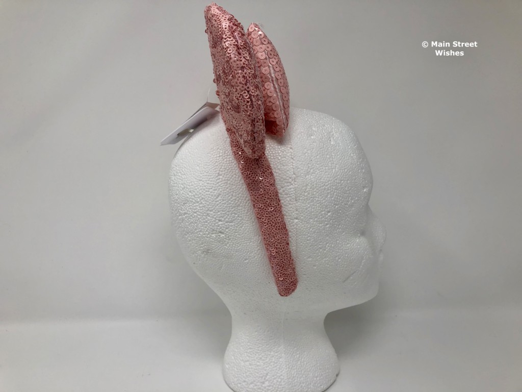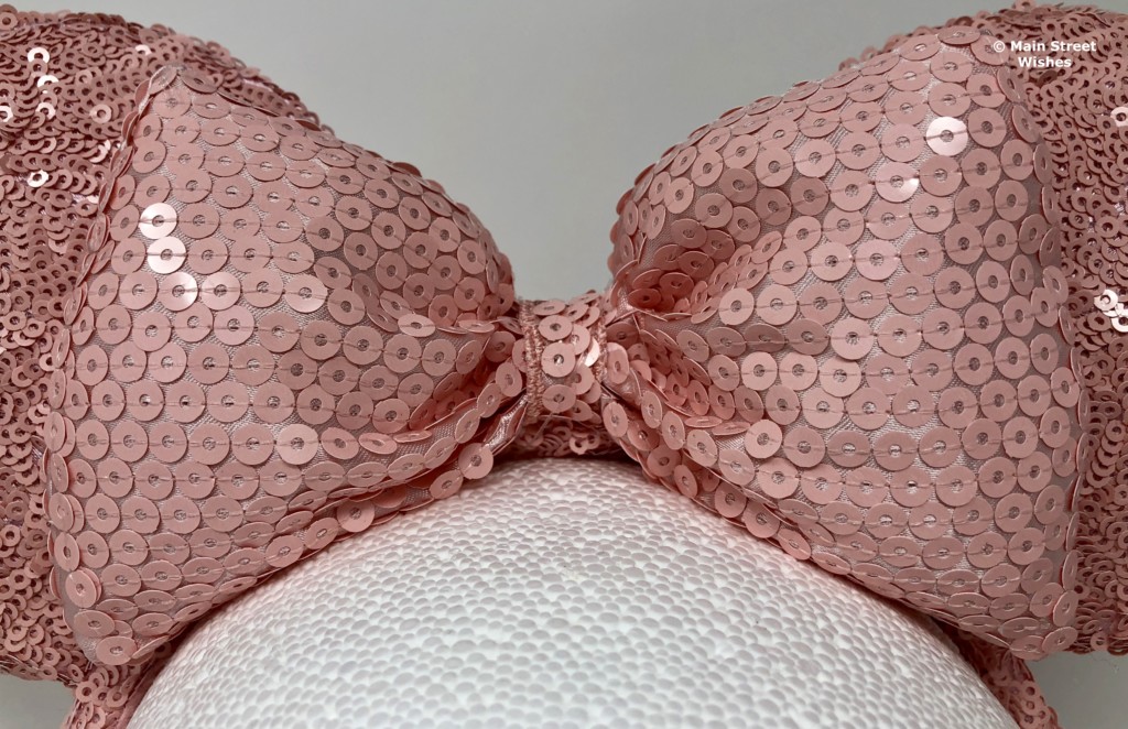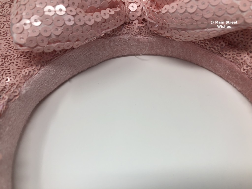 The bow is also covered in the millennial pink sequins, but you can see more of the satiny material behind the sequins, which is the same color. Each side of the bow is secured to the ears, so it can’t move too much. In the middle of the bow is a strip of the same satiny material covered with millennial pink sequins.