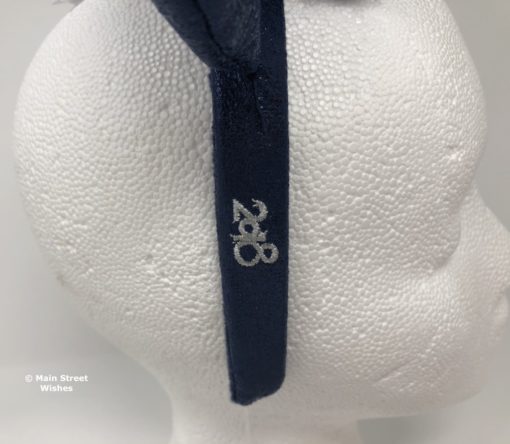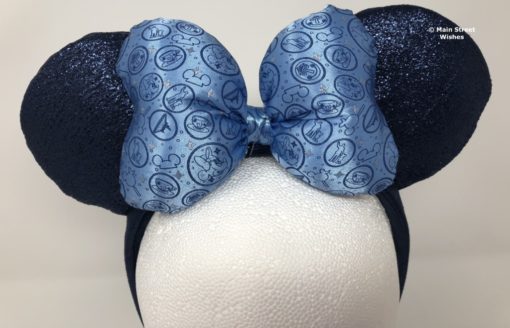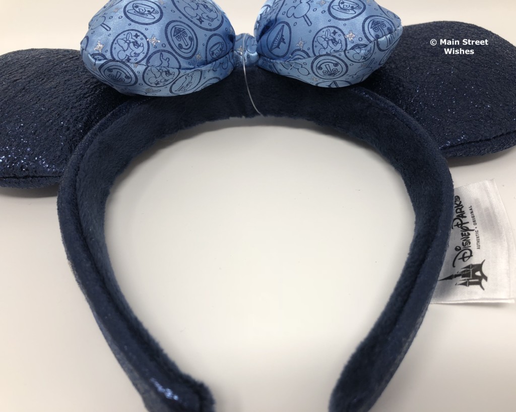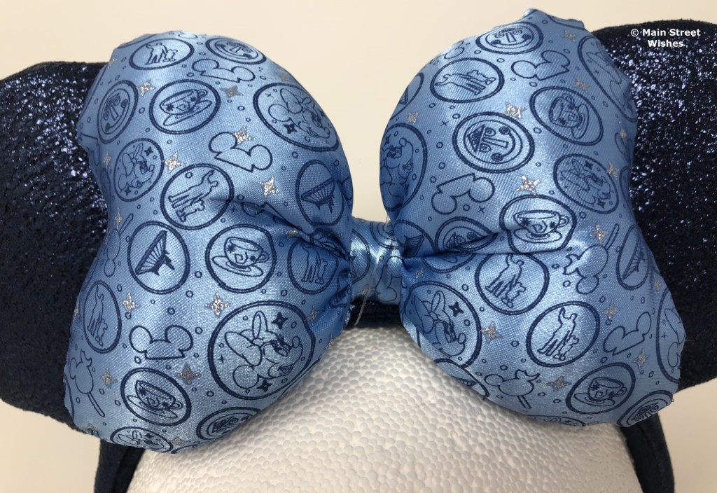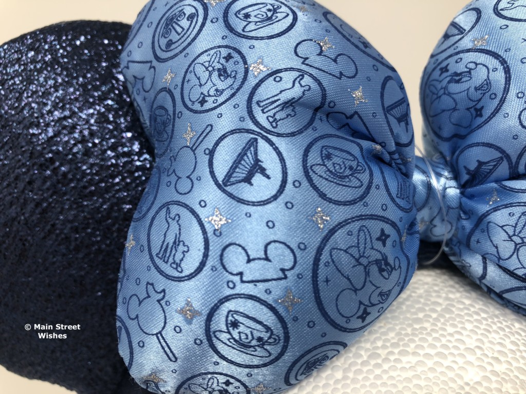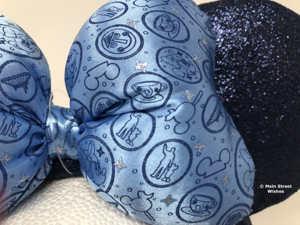 The bow is my favorite part of these ears. It’s not just a solid color, it’s light blue and has pictures of different well-known things related to Disney World. Pictures on bow include Disney characters, Disney rides, Disney snacks, and icons of the parks. Plus, there are little sparkly silver stars that dot the bow.