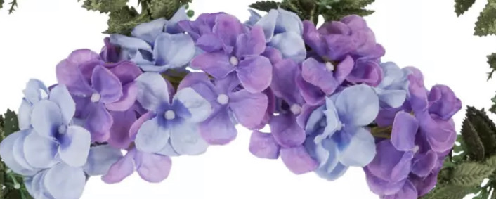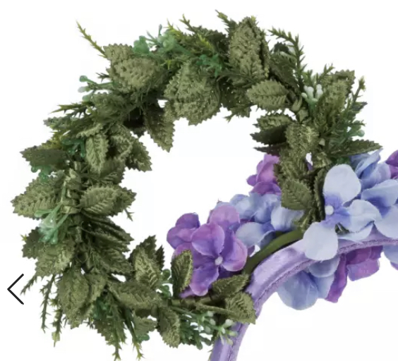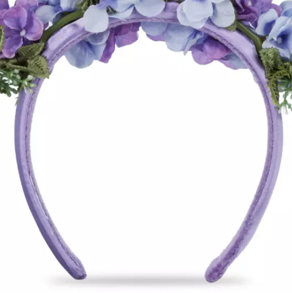 There is no bow on this pair. Instead of a bow, there is a very pretty bunch of fabric hydrangea flowers. The flowers are a mix of light blue and purple. The back of the ears have some flowers as well, though not as many can be see.