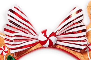 The ears on these ears are shaped like Mickey and Minnie Mouse gingerbread cookies. Both have peppermint candies on their cheeks and white detailing to look icing. The Mickey Mouse ear is decorated with a little Santa hat and a green bow with a peppermint candy decoration in the middle. Minnie Mouse’s bow has been updated from last years ears, which had a green bow. This year’s ears have a red bow with a peppermint candy decoration in the middle. The detailing on these ears is really cute.