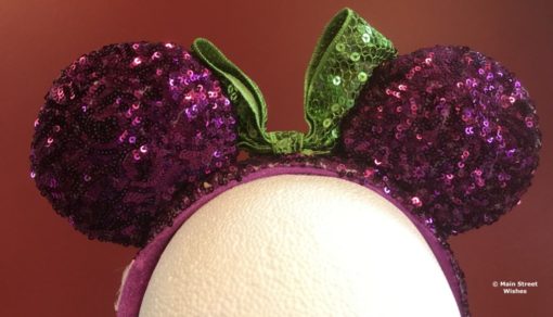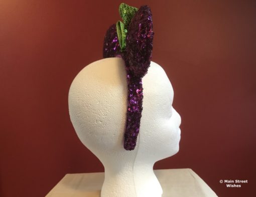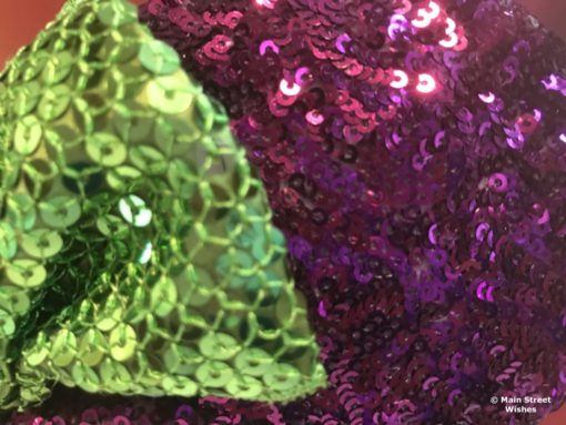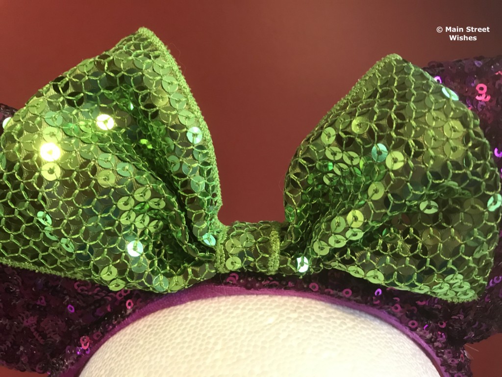 The purple and green colors are complimentary to the colors in Minnie’s witch costume for Halloween. The entire headband is covered in sequins, so they are very sparkly. Since the whole headband is sequined, you have to be a little careful with it. If some of the sequins come off it will leave an obvious hole on the headband.