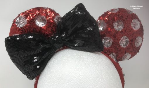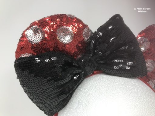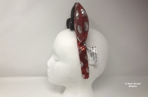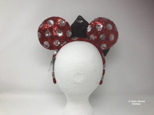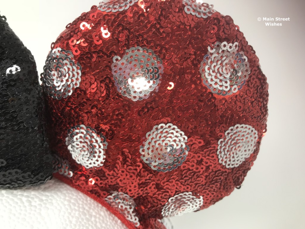 Sequins cover both the ears and the headband. There are red sequins and silver sequins. The red sequins make up the main part of the ears and headband. The silver sequins make up the polka dot design. The ears have a soft material inside and the headband is lined with a soft, velvety material.