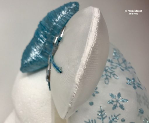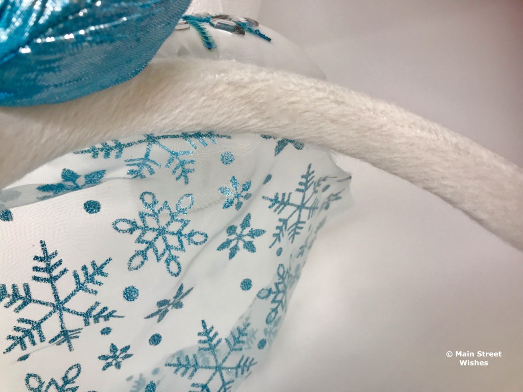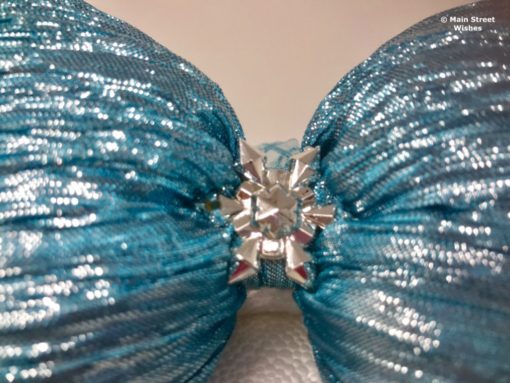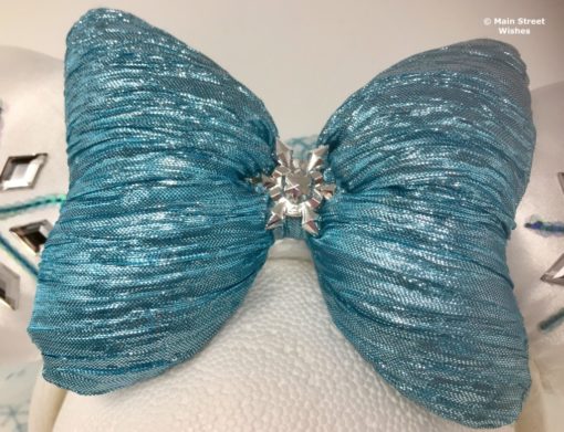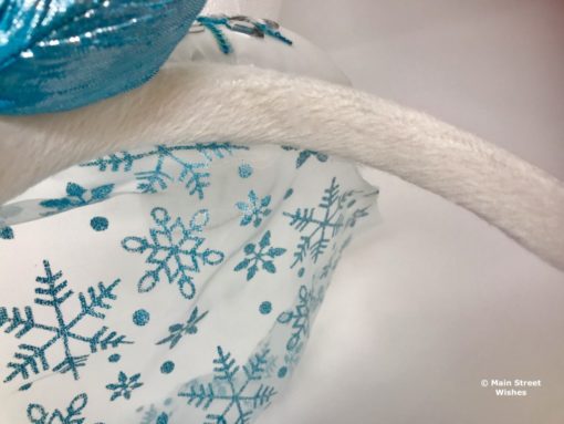 The bow that sits in between the ears is also very puffy, just like the ears. It is made of a turquoise colored material and has a shimmer to it. A snowflake gem sits in the middle of the bow, incorporating the snowflake theme even more into the headband design.