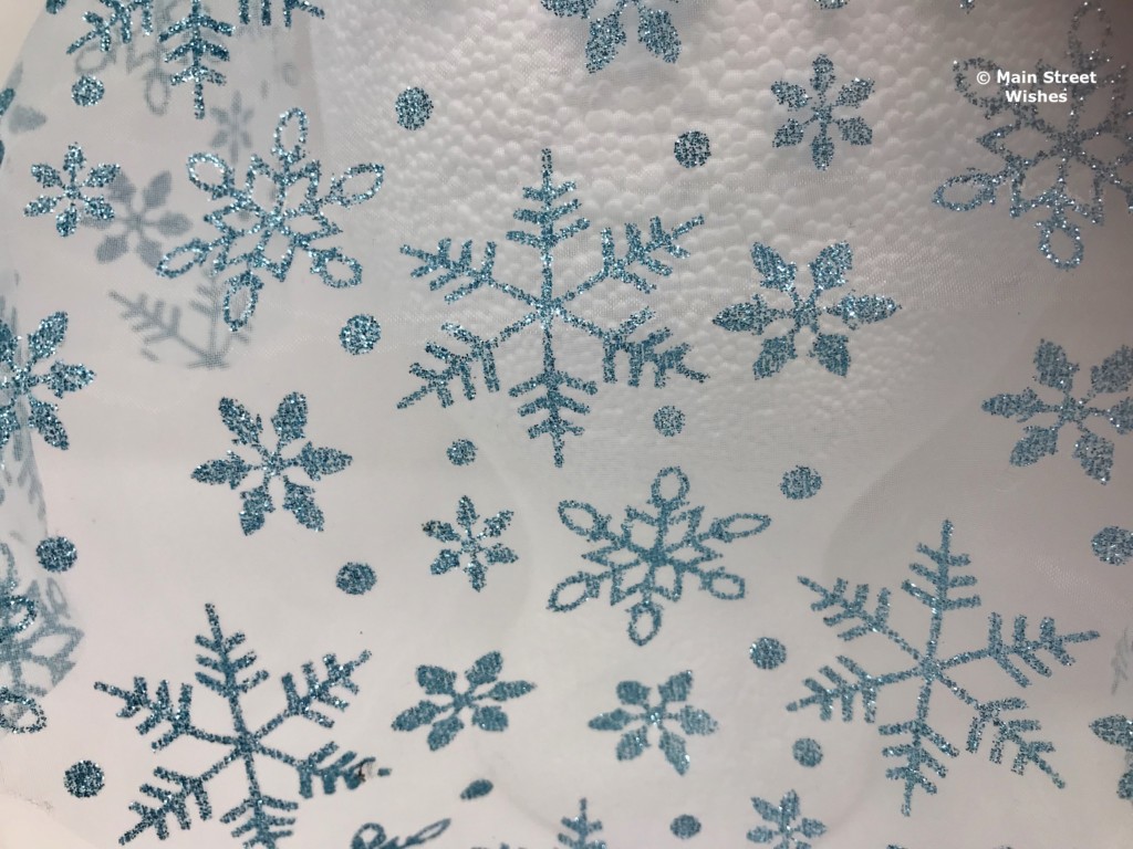 On the back of the headband is a veil with snowflakes. The veil is made of a white netting material and the snowflakes are the same turquoise color that the bow is, but made out of glitter.