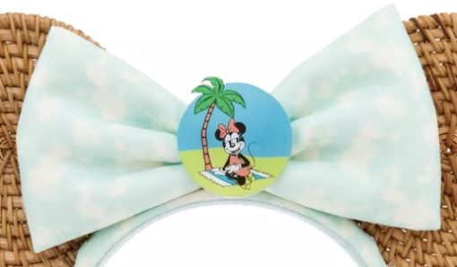 The bow is made of a woven twill material and tie-dyed with a light bluish green color. The color used is pretty and adds to the overall summer feel of the headband. In the middle of the bow is a picture of Minnie enjoying her time on the beach.