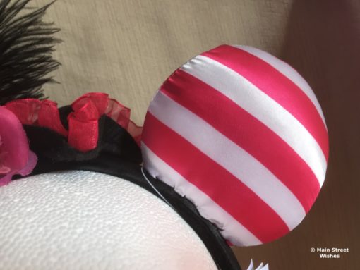 The ears on the headband are thick and covered with a silky material that is pink and white striped. Since the ears are thick, they are soft to the touch and can easily be squeezed. The headband has a black silky material on the outside and a soft velvety material on the inside (making it comfortable to wear).