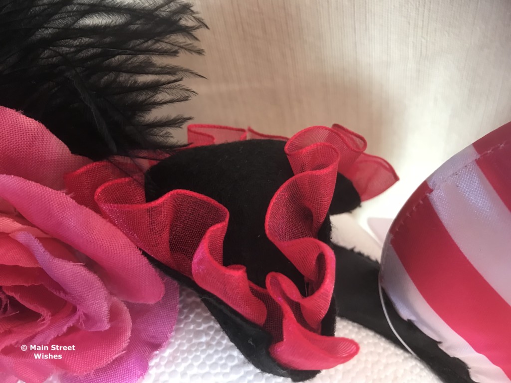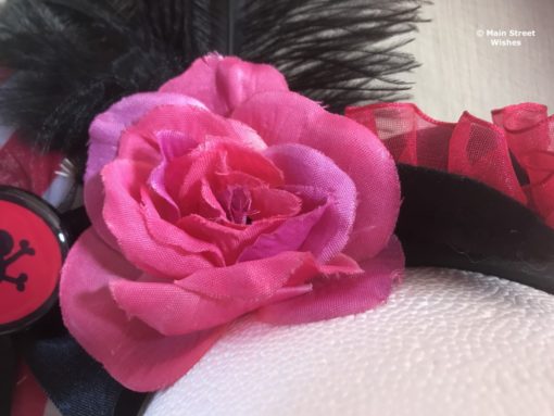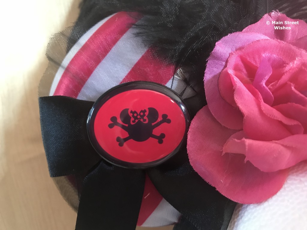 The black bow with the pirate Minnie button is next to the flower. The bow is a ribbon and the button is plastic. Behind the bow is black crinoline, which the bow and button are glued too.