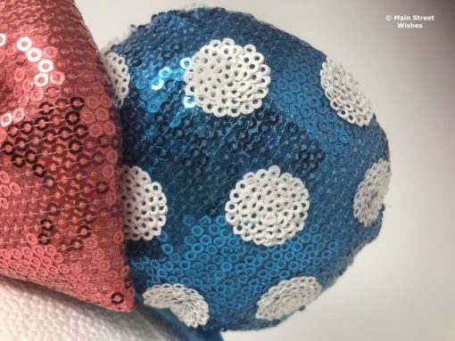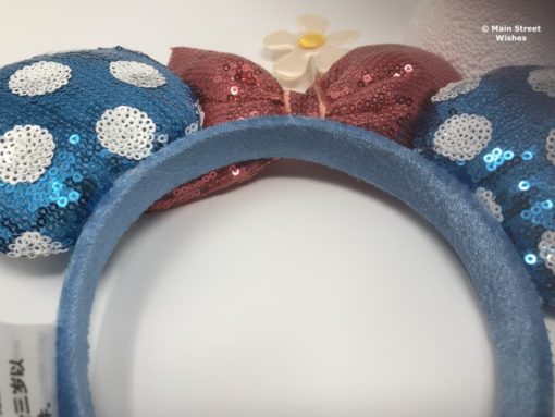 The bow is a soft pink color and is covered in sequins. Also on the bow is the flower sticking out the top. The flower is such a cute addition to these ears and part of the reason why I really like this pair. The flower is made of that same satiny feeling material that is on the outside of the headband.