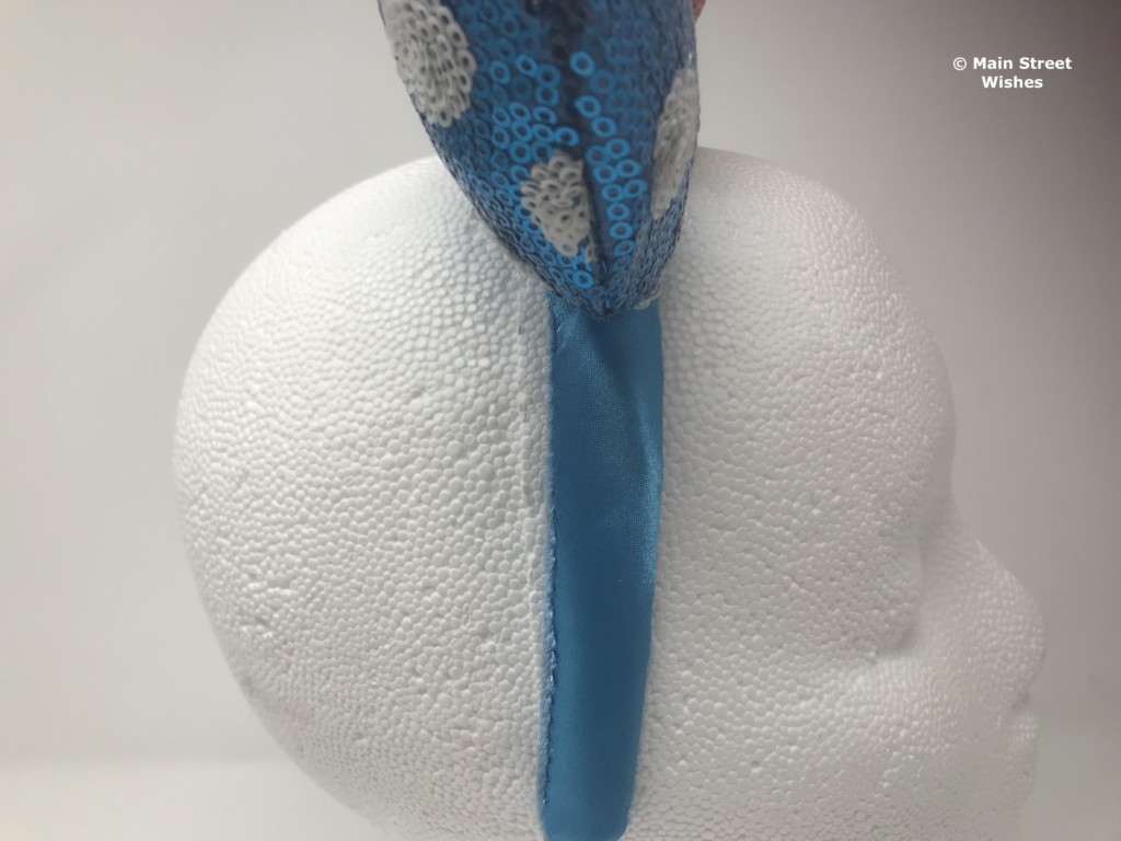 The ears and headband are that pretty blue color. Also, on the ears are white polka dots. There is quite a bit of stuffing in the ears, so they are very squishy. On the ears are sequins in blue and white, which makes them very sparkly. The headband has a satiny feeling material on the outside and a velvety feeling material on the inside. Both the inside and the outside of the headband match the blue color of the ears.