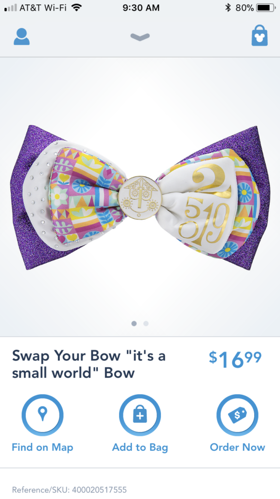 - “it’s a small world” Bow – This bow has the same Mary Blair design that is so well known with the ride. The colors and the iconic clock face as the centerpiece of the bow make it very easy to tell what theme this bow is.