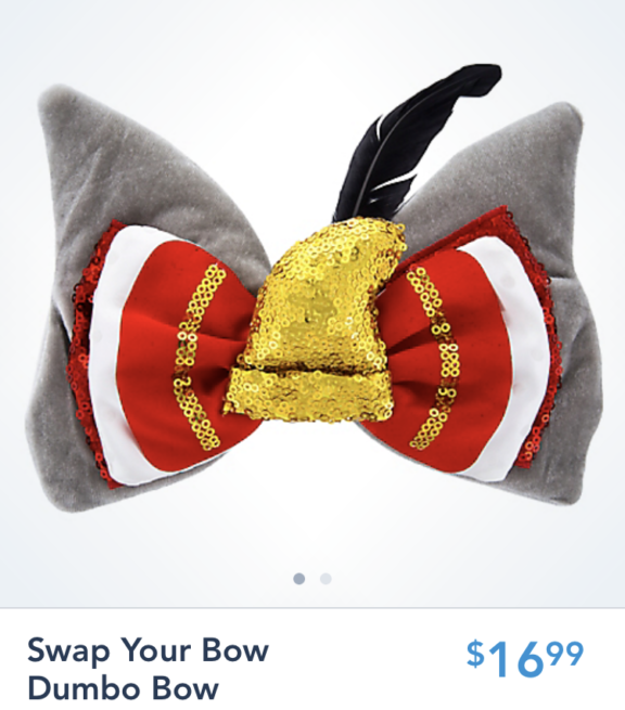 - Dumbo Bow – This bow is super cute. Of course the centerpiece of the bow is Dumbo’s famous hat with his lucky feather sticking up. There’s no mistaking which character this bow represents!