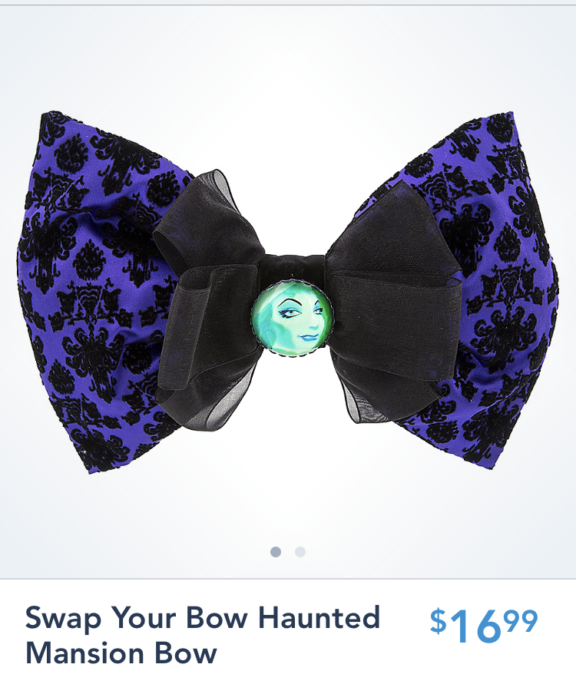 - Haunted Mansion Bow – The popular purple and black design of the wallpaper in the Haunted Mansion makes up the bigger bow and a smaller black crinoline bow is connected to it. In the centerpiece you will find one of the most famous characters from the ride, Madame Leota.