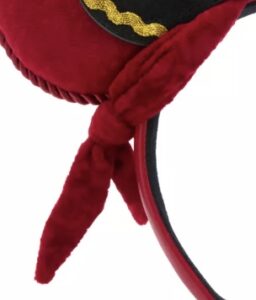 There is no bow on this headband. Instead, sitting in the middle is a faux leather pirate captain’s hat. In the middle of the hat is a raised skull and crossbones, and around the edge of the had is a gold braided material. Also, there is a bandana knot to the side made of the same material that covers the ears.