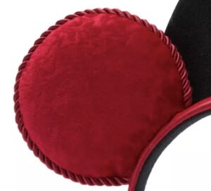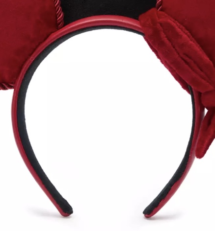 The ears on this headband are soft and padded. The material on the ears is a red velvet debossed brocade fabric. A shimmering cord of the same color trims the edge of the ears.
