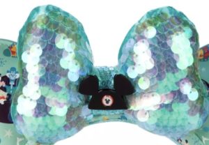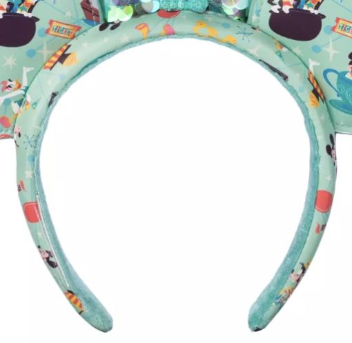 The bow on this headband is very sparkly, because it’s made of iridescent sequins in the same color as the background of the ears and headband. In the middle of the bow is a Mickey Mouse ear hat charm. So the ears show some of the classic rides and the bow highlights the classic ear hat.