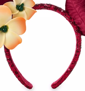 Satin material with a tropical pattern covers both ears. The tropical pattern on the ears fits with the island theme of the whole headband. A fun feature of these ears includes a surprise character shape. If you look closely at one of the ears you’ll see a Hidden Mickey.