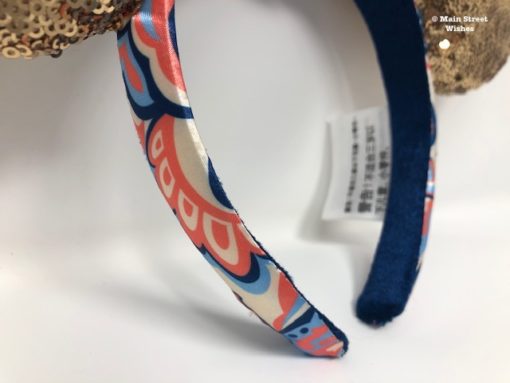 The outside of the headband is covered in the same pretty patterned material as the bow. On the inside of the headband is a soft dark blue material and the dark blue matches the dark blue in the bow.