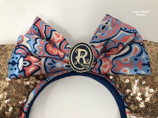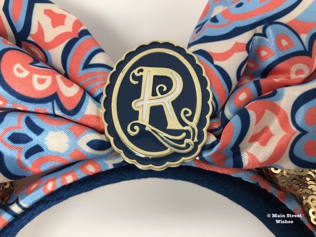 The bow has the same pretty pattern that can be found on the costumes of cast members. The colors in pattern include light blue, dark blue, pink, and white. I love this pattern and the colors are really pretty together. In the middle of the bow is the Riviera Resort’s logo with their signature “R” design.