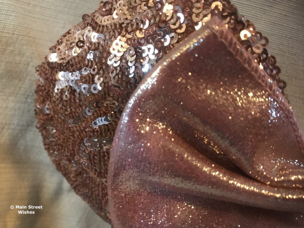 The bow is also a rose gold color. The material it is made from is very soft and shiny. The bow has an almost iridescent color to it, but the shiny material is only on the outside. The inside of the bow is the same color as the inside of the headband and it’s soft too.